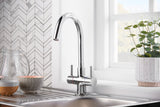 A modest dual handle mixer with simple peg lever handles and a swivel spout.