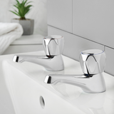 A modern design with a durable chrome finish, this pair of basin taps are suitable for all water systems and will complement all bathroom designs.